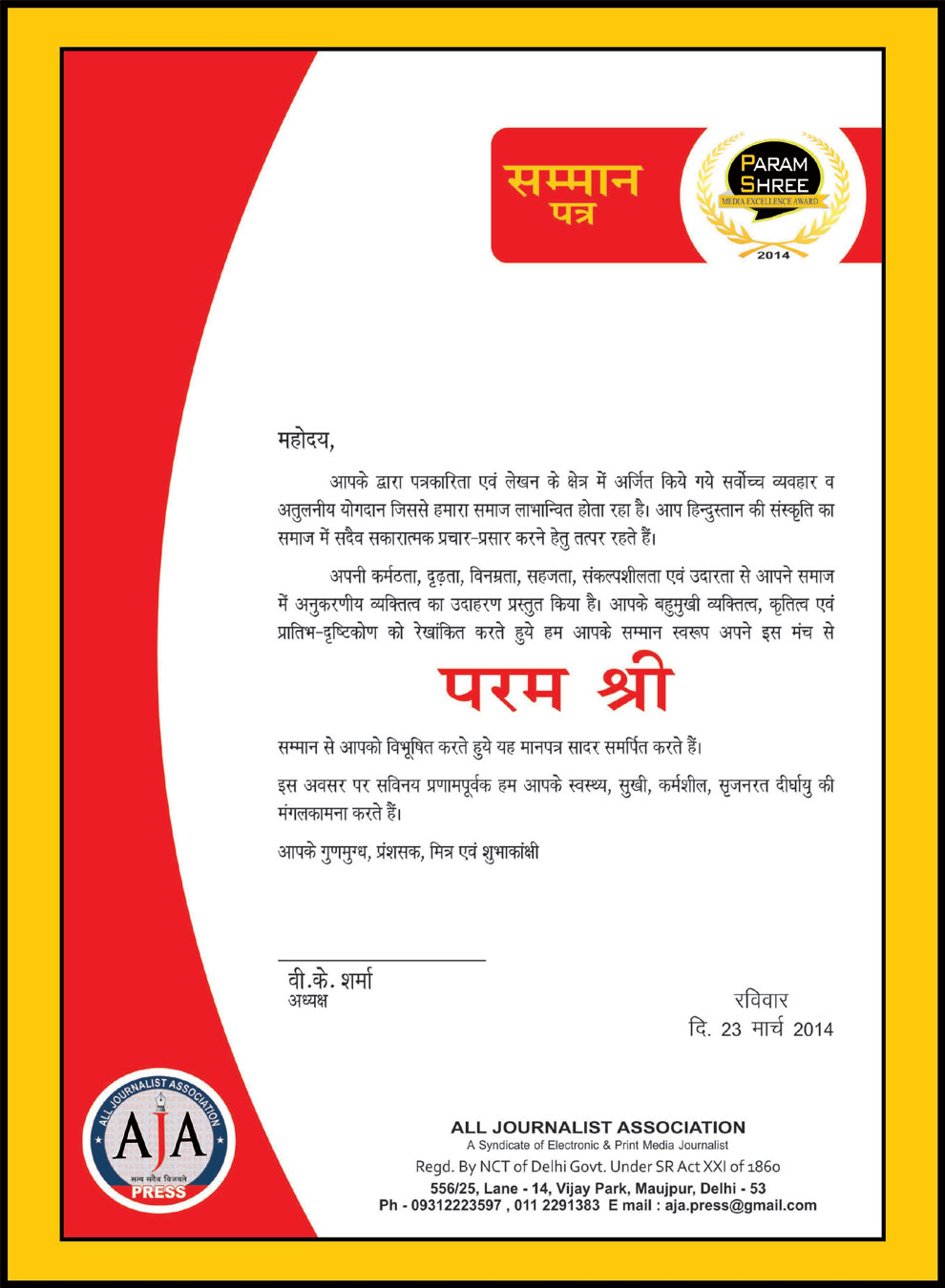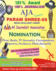 In its past years history, the All improved standard and working conditions for journalists and greater Co-operation with its colleagues around the Delhi or all over India . AJA largest membership bases are generally concentrated in metropolitan city Delhi,members are also organised in the other areas throughout the Delhi or India. AJA has also relied on leadership in the community and print and electronic media. The ALL JOURNALIST ASSOCIATION (AJA) was founded and registered by Delhi Govt. in 2006, by V.K.Sharma(Journalist) with few Delhities media persons. The ALL JOURNALIST ASSOCIATION (AJA) is the Non-Profit Organisation that speaks for Journalists/media related persons around the Delhi. AJA committed to Starting coaching to journalists who needs training to increase their proficiency in the Media industry, We will be Organizing seminars time to time to Raise the standards of journalists and Protects and improves the rights of journalists AJA serves humanity by encouraging young people to consider journalism as a career,developing managers in the media industry,and promoting fair and accurate news coverage.