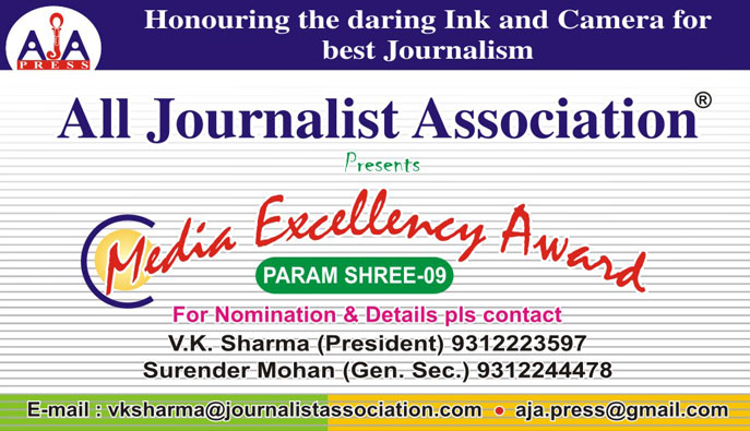 In its past years history, the All improved standard and working conditions for journalists and greater Co-operation with its colleagues around the Delhi or all over India . AJA largest membership bases are generally concentrated in metropolitan city Delhi,members are also organised in the other areas throughout the Delhi or India. AJA has also relied on leadership in the community and print and electronic media. The ALL JOURNALIST ASSOCIATION (AJA) was founded and registered by Delhi Govt. in 2006, by V.K.Sharma(Journalist) with few Delhities media persons. The ALL JOURNALIST ASSOCIATION (AJA) is the Non-Profit Organisation that speaks for Journalists/media related persons around the Delhi. AJA committed to Starting coaching to journalists who needs training to increase their proficiency in the Media industry, We will be Organizing seminars time to time to Raise the standards of journalists and Protects and improves the rights of journalists AJA serves humanity by encouraging young people to consider journalism as a career,developing managers in the media industry,and promoting fair and accurate news coverage.